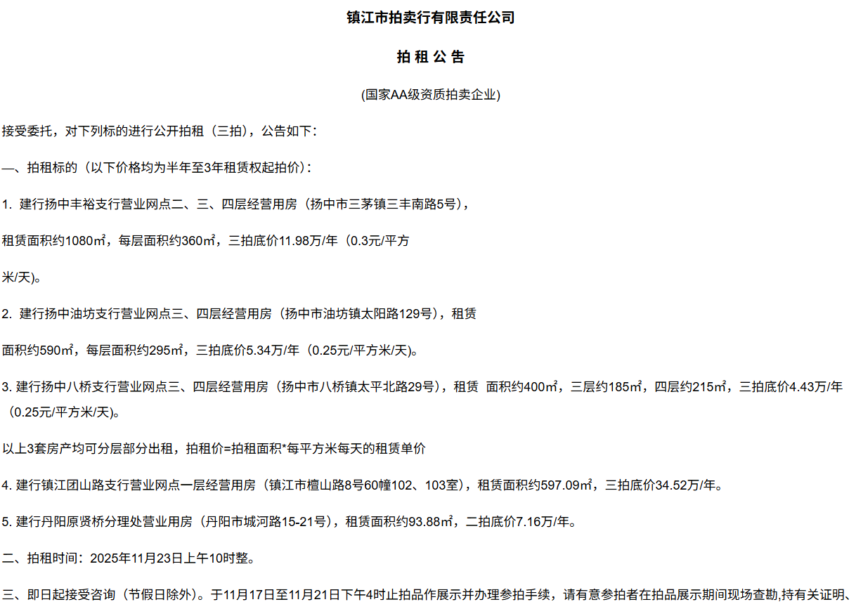 本公司受鎮江市公安局委托,對2025年度鎮江市市區摩托車上牌額度認購權進行拍賣,現將有關事項公告如下: